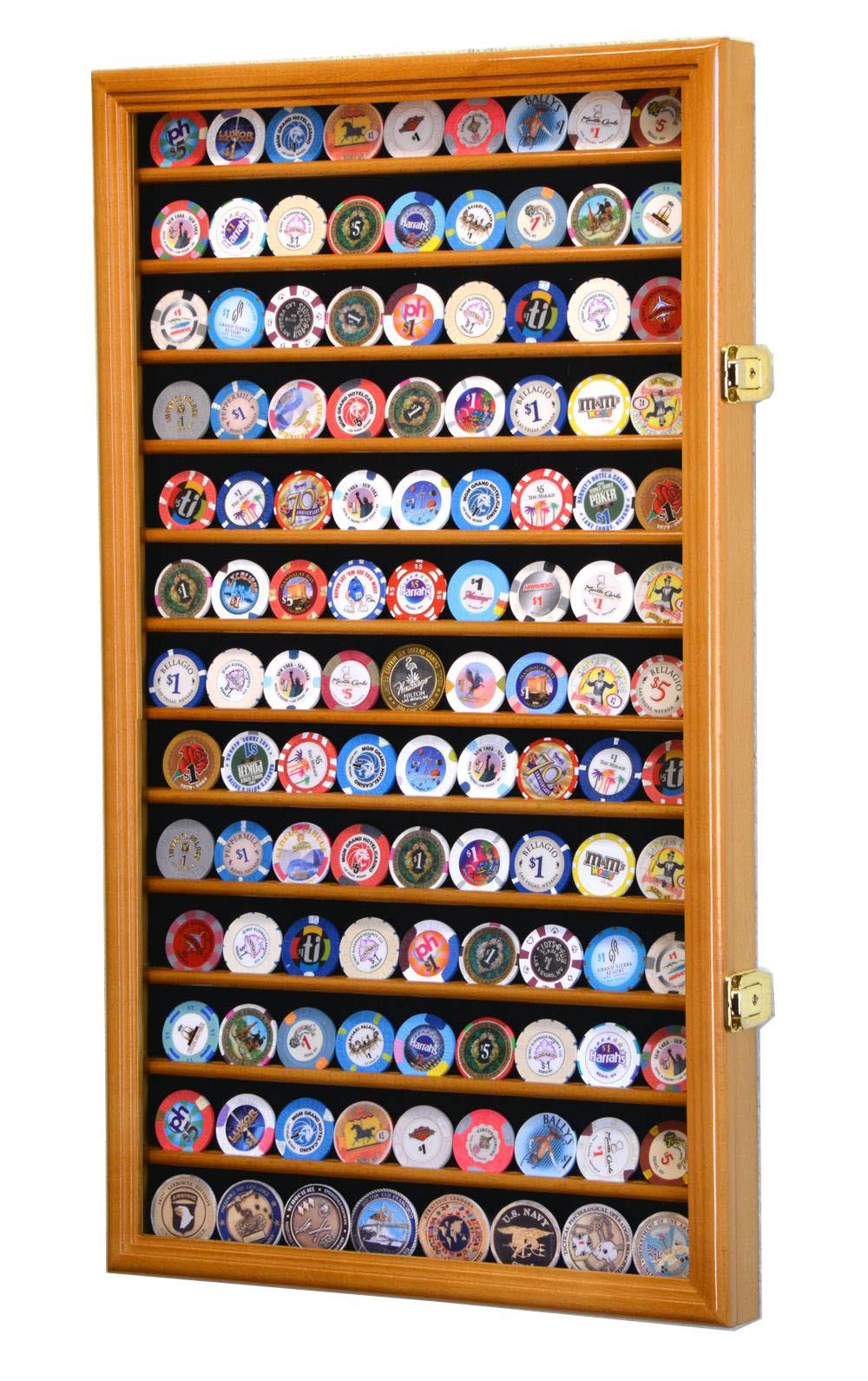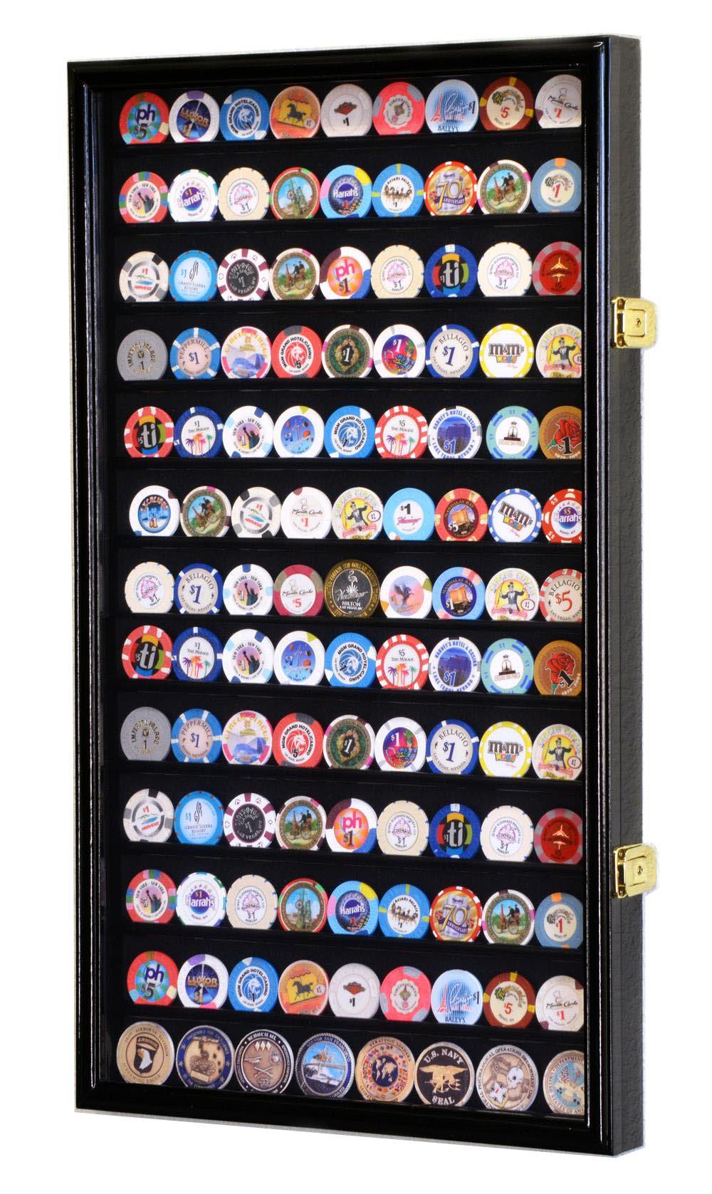 Display it in this beautiful 117 Casino Chip Display Case Cabinet, designed with a UV-protection acrylic door and 13 grooved shelved to securely showcase up to 117 standard-sized casino chip coins.