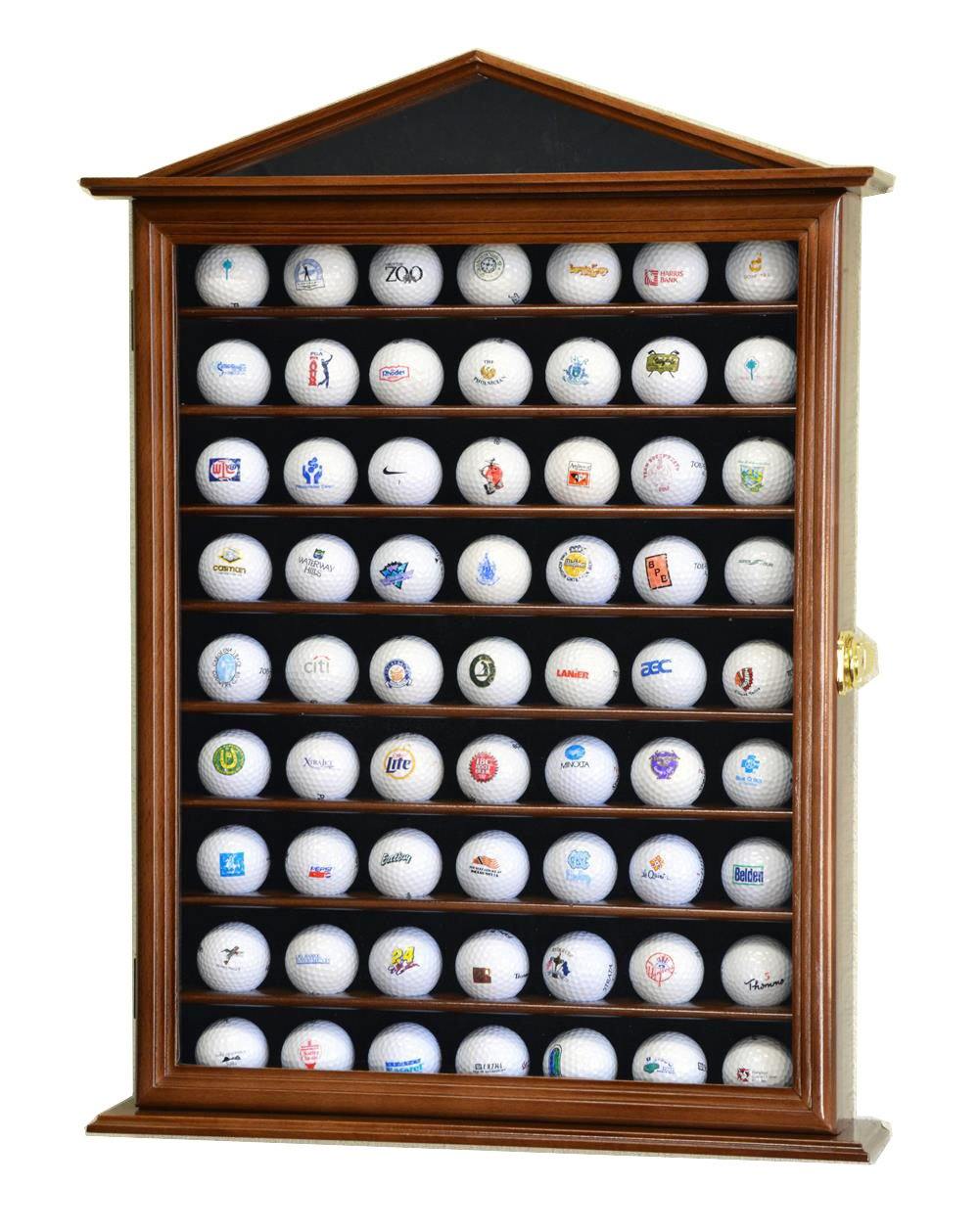 Display it in this beautiful 63 Golf Ball Display Case Cabinet, designed in a designer style with a crown trim, plexiglass door, and 9 grooved wooden shelves to hold up to 63 golf balls.