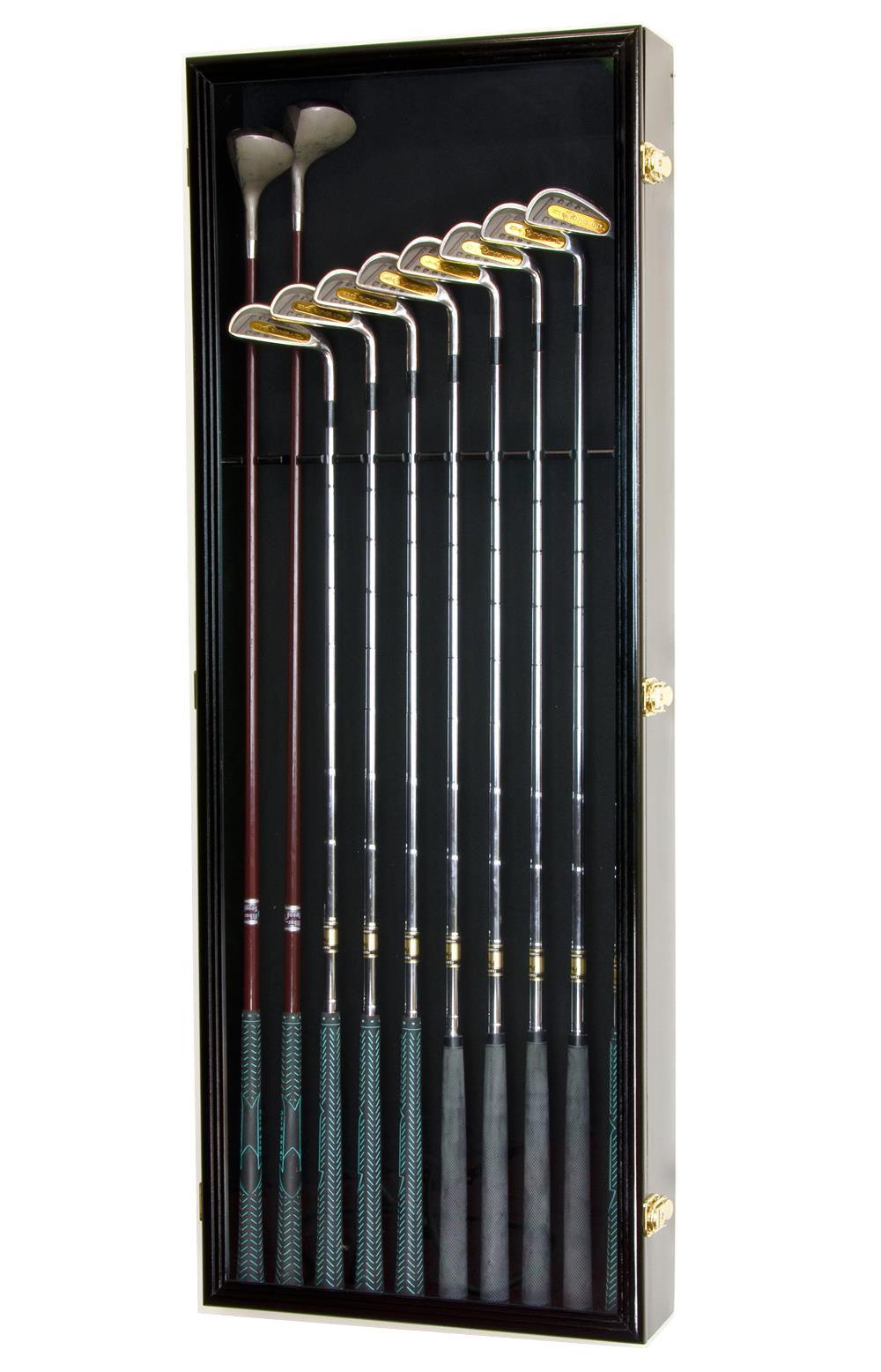 This display case can accomodate up to 10 golf clubs (up to 44"), displayed upright in an evenly notched shelf. Perfect for displaying your range of golf clubs from drivers, irons, and putters. Protected by our ultra-clear specially coated plexiglass. Front opening door. Case comes fully assembled. Mounting hardware is shipped in the same package.