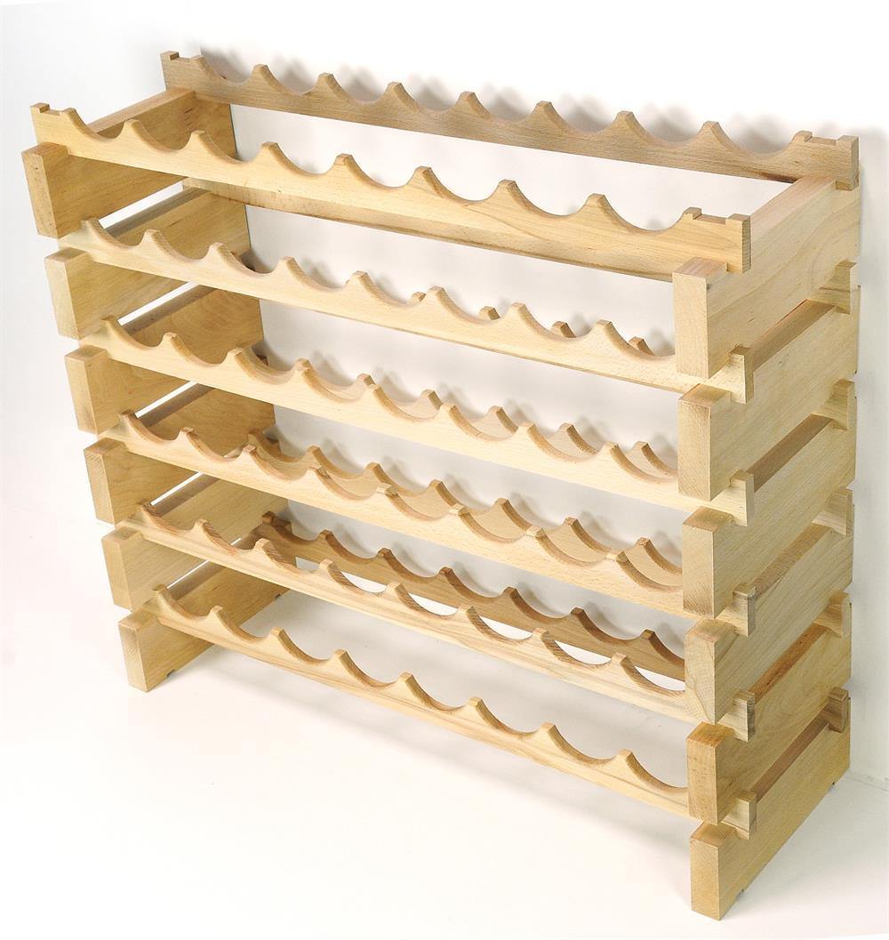 This modular hardwood wine rack is handcrafted from furniture-grade pine hardwood. Featuring rows with beveled edges, each rack can hold up to 8 standard-sized wine bottles. The wood is sealed and can be displayed as is but allows you the option to stain, paint, or varnish to match any decor. Our sturdier design is wobble-free and has interlocking joints for maximum stability. Requires minimal assembly.