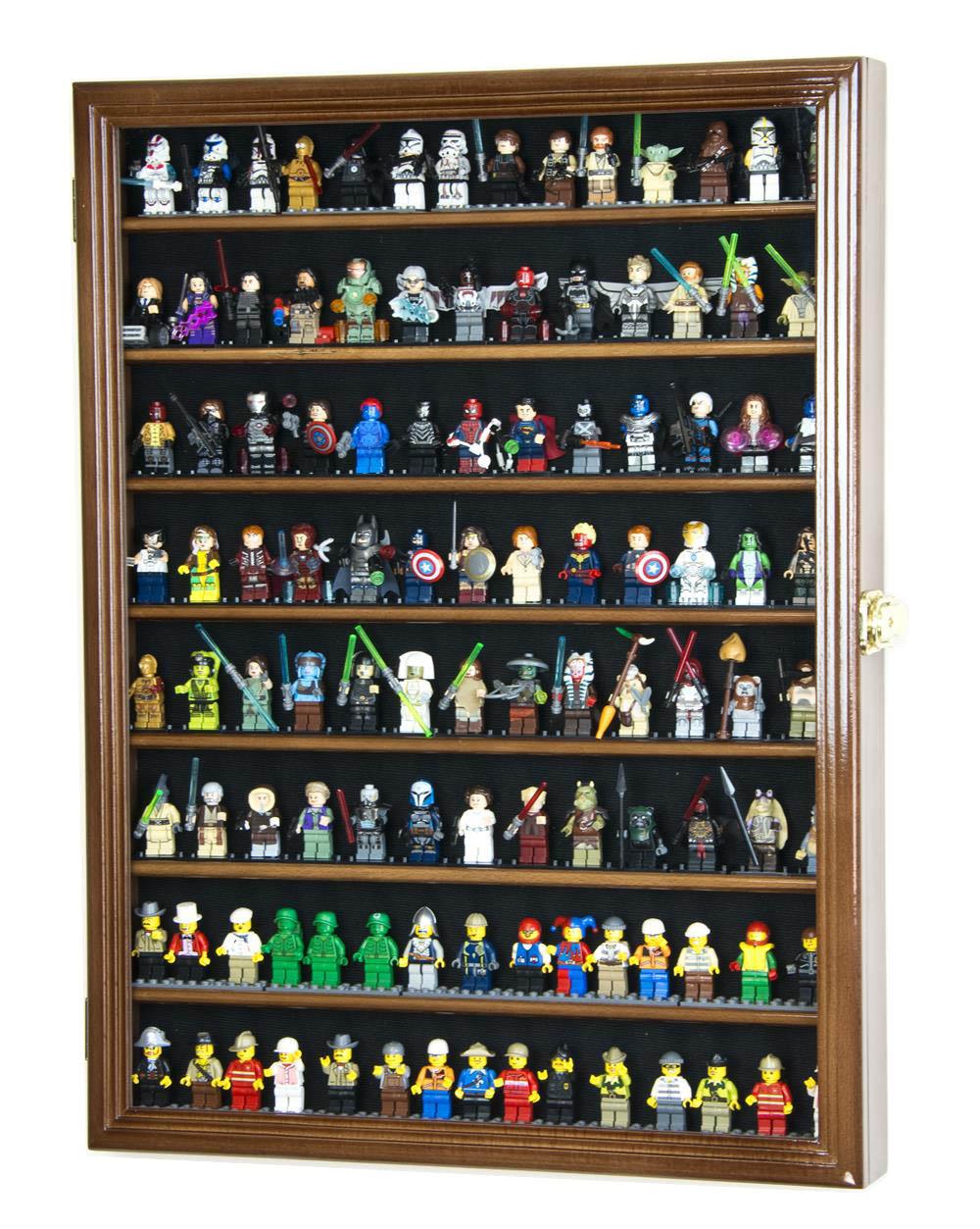 This minifigures display case features 8 rows to fit 110+ minifigures. This cabinet has extra height to fully display larger figurines or small figurines holding tall items. Each shelf has an over lip to keep your items from falling. Protected by our ultra-clear specially coated plexiglass. Brass hinges and lockable brass latches with 2 sets of keys. Case comes fully assembled. Heavy duty wall mounting kit included. Mounting hardware shipped in the same package.